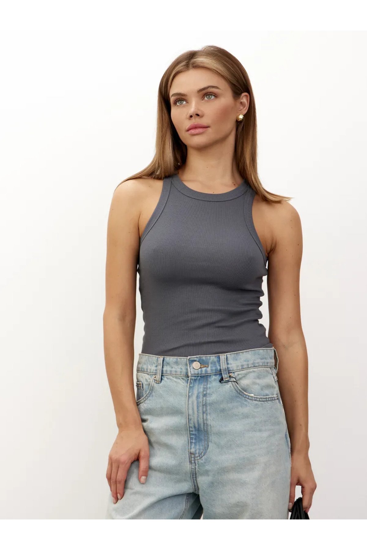 Pamuk Fitilli Kaşkorse Halter Yaka Geniş Biyeli Örme Atlet Crop – Gri