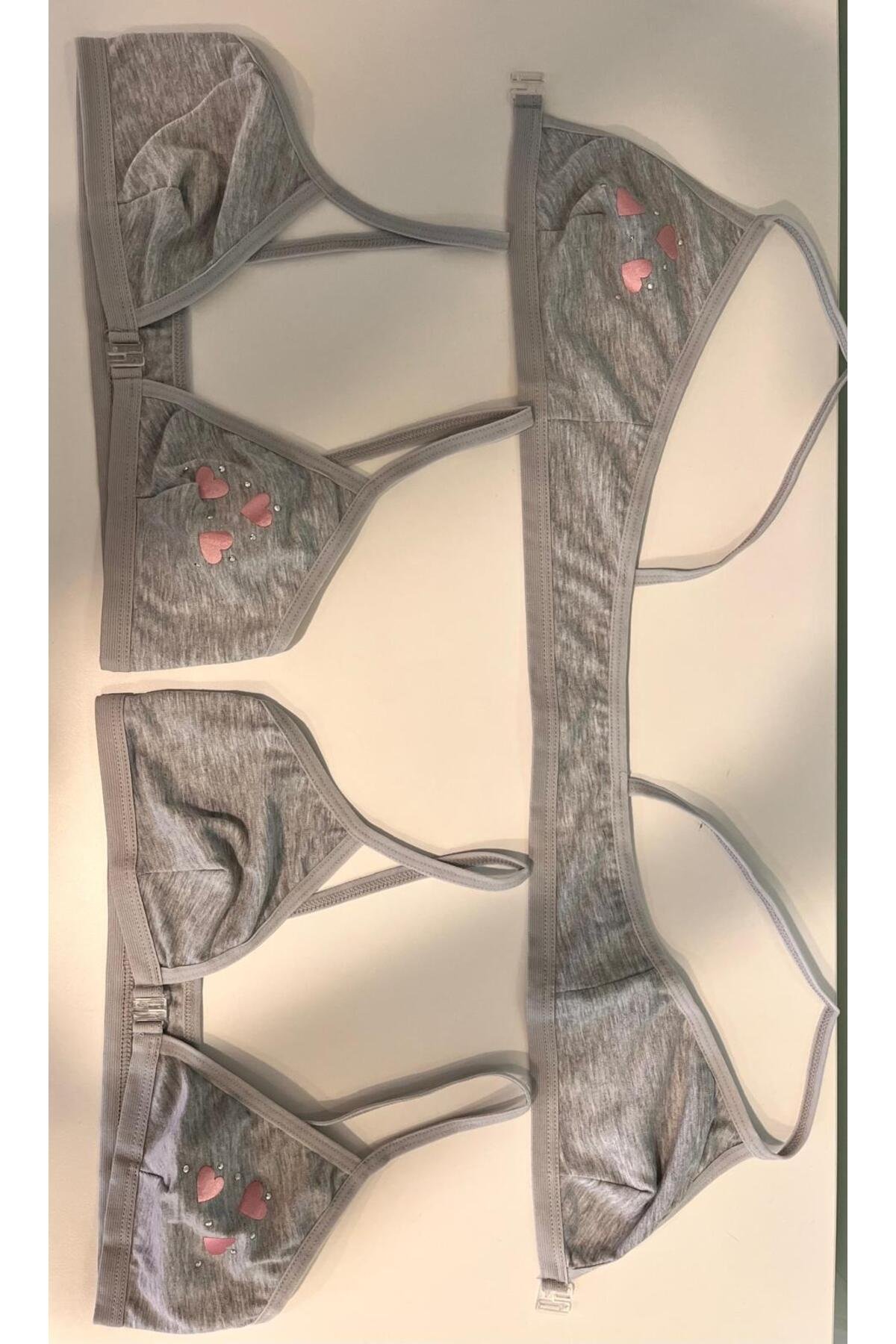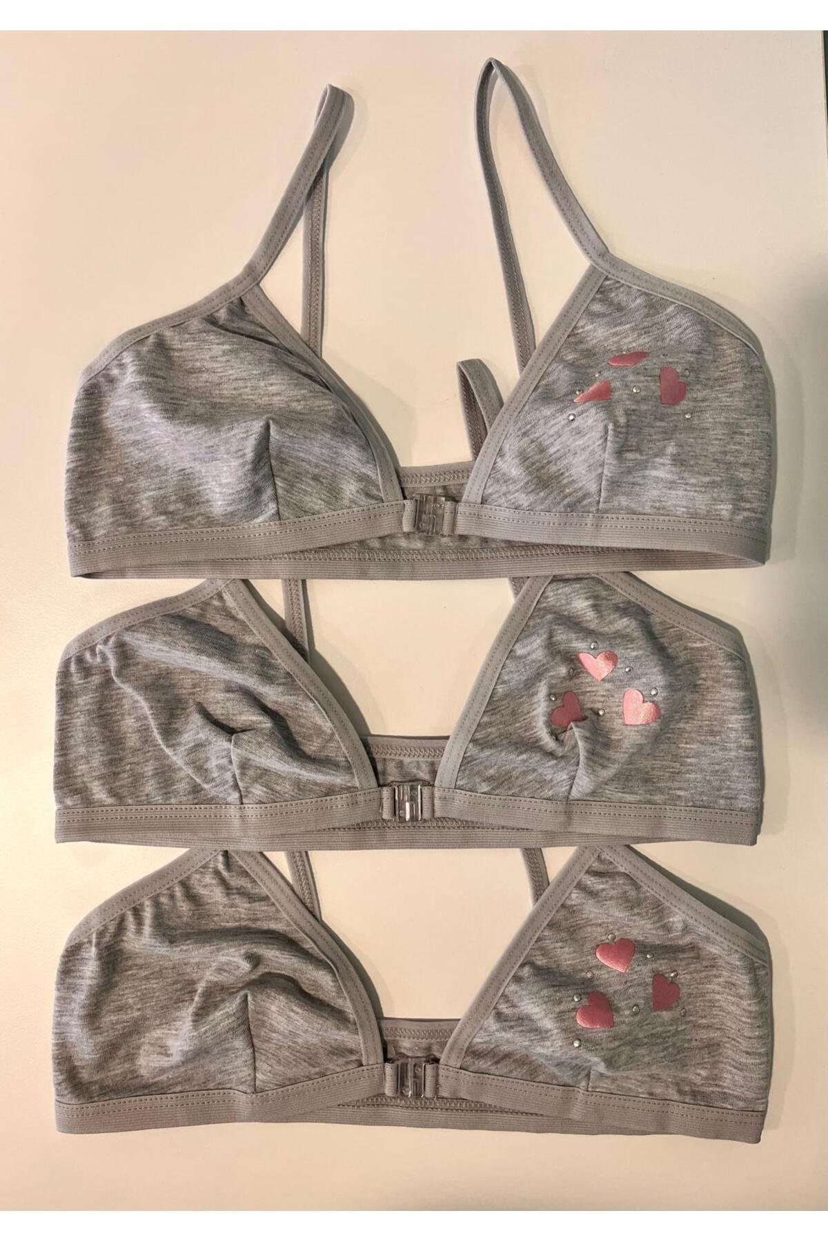 3’Lü Paket Kız Çocuk Taşlı Pamuk Alıştırma Sütyeni Likralı Pedsiz Lastik Askılı – Gri